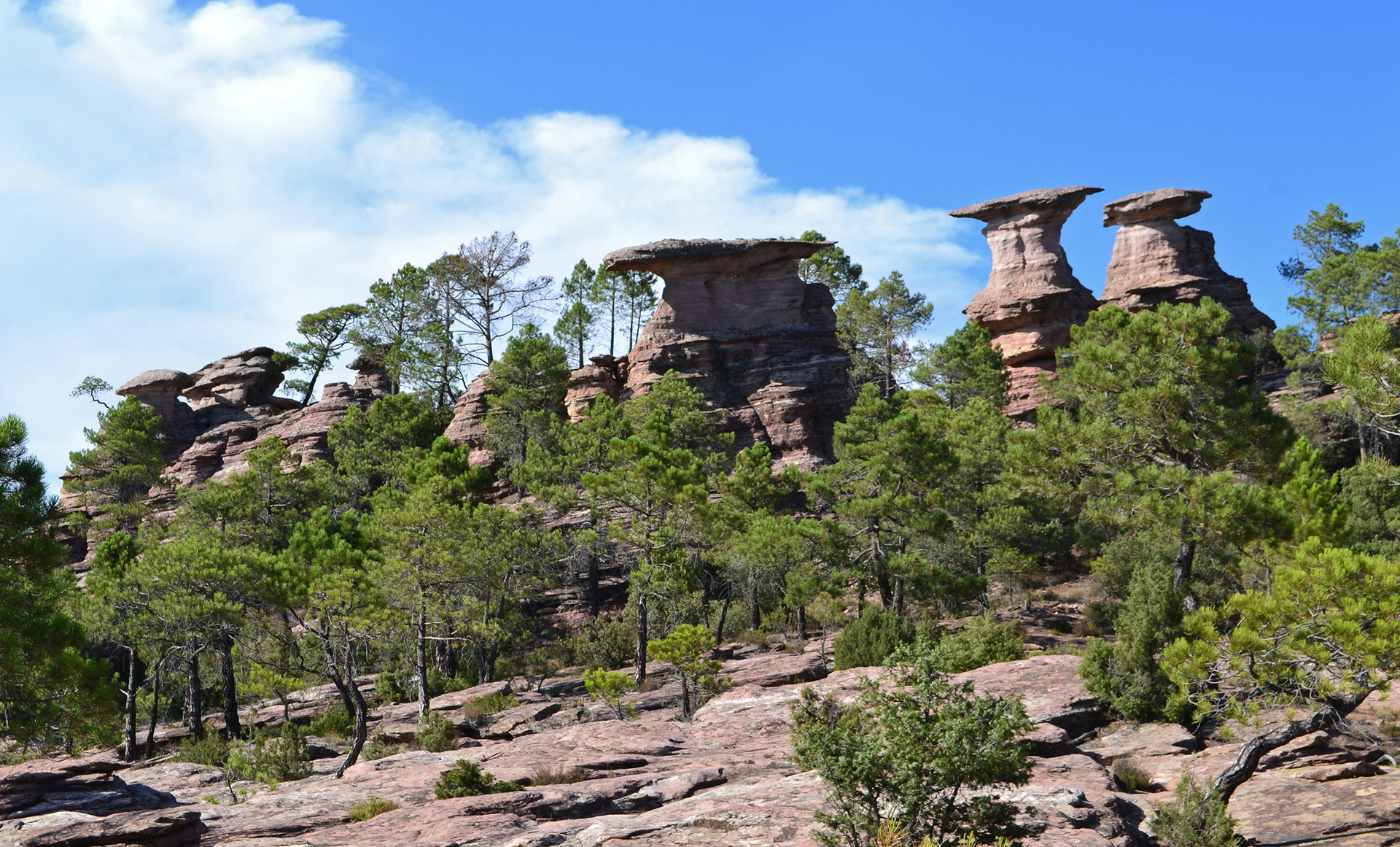 Sin embargo también aparecen otros tipos líticos. El más curioso y pintoresco es sin duda la arenisca roja y las pudingas del Bundsandstein (subperiodo Triásico), conocida como rodeno por estas y otras tierras. El rodeno aparece en forma masiva en varias zonas del territorio (Sierra de las Cuerdas, Sierra de Valdemeca, Sierra de Mira) y en pequeños afloramientos por toda la comarca dando lugar, con sus peculiares procesos erosivos, a formas caprichosas e increíbles. En lugares muy concretos localizados en los términos municipales de Boniches, Talayuelas y Garaballa existen afloramientos silúricos y devónicos de pizarras y esquistos, de extensión muy limitada y que constituyen las rocas más antiguas de la provincia de Cuenca. Otras zonas registran afloramientos salinos del Keuper que han dado lugar a formas más o menos organizadas de explotación de la sal, cuyos máximos exponentes en el área se localizan en las poblaciones de Salinas del Manzano y Monteagudo de las Salinas.